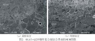 利用掃描電子顯微鏡對爆炸銹鋼復合板的結合界面進行了觀察,發現不銹鋼與碳鋼之間存在兩種結合方式,一種是直接結合(如圖2a所示), 另一種是間接結合(如圖2b所示)。間接結合方式中的中間層是由于基板和復板中的合金元素互溶形成的,該區域的化學成分介于復板和基板之間[5]。因為經歷了金屬熔化和凝固階段,熔合層易出現氣孔、裂紋等缺陷,成為界面結合較薄弱的區域。從圖2中還可以發現,不管是以何種方式結合,界面附近都有超細晶粒帶出現。這是在爆炸過程中由于材料的高速碰撞,在極短的時間內產生巨大的壓力使該處金屬受到很大的剪切作用,塑性剪切功轉變的巨大熱量使金屬在很窄的區域內發生熔化,之后又急劇冷卻,故形成極細的組織,甚至有非晶組織形成[6]。